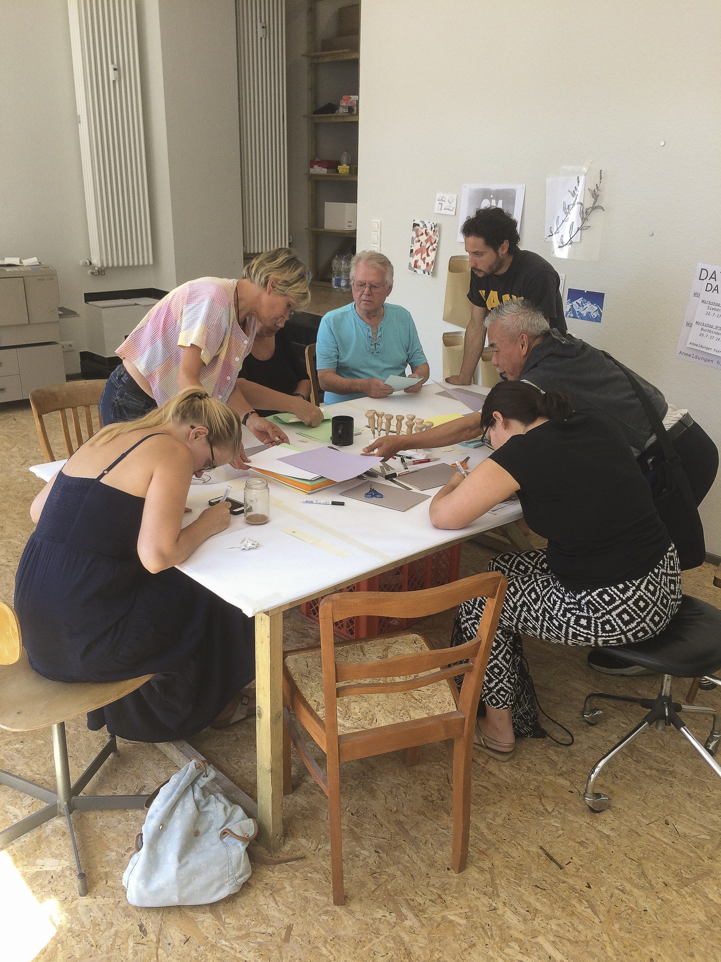 Diverse Workshops unter Anleitung boten die Möglichkeit, eigene Entwürfe, Objekte und Waren zu gestalten. Besucher:innen waren fortan nicht mehr nur Kund:innen, sondern auch Produzent:innen ihrer eigenen Produkte. Zum Einsatz kamen Siebdruckverfahren, Gießformen werden erstellt um Kleinmöbel zu kreieren. Mit Buchbindearbeiten entstanden Kalender und Notizblöcke. Die gefertigten Produkte konnten mit nach Hause genommen oder im Laden verkauft werden. So entand ein Ort, in dem nicht bloß Ware getauscht, sondern auch Wissen geteilt wurde.